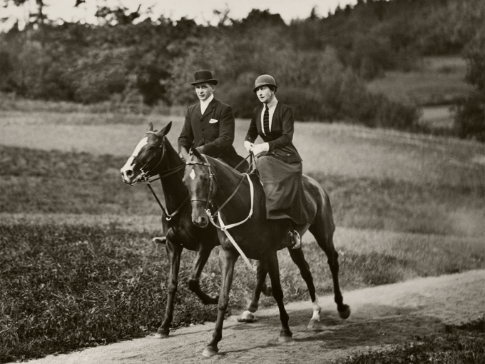 Dronning Maud i sidesal på «Diamond» og rideknekten Alfred Cobb på «Emerald» under en ridetur på Bygdøy på 1930-tallet. Fra Dronning Mauds fotoalbum, De kongelige samlinger.