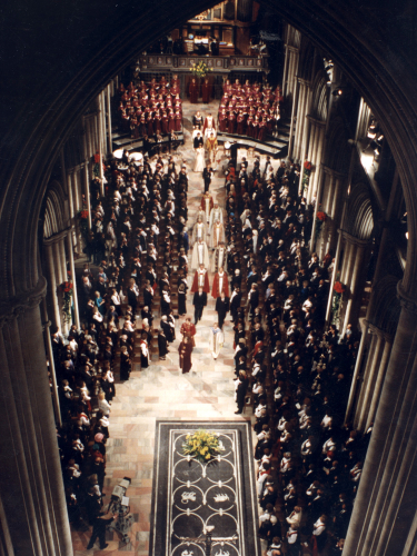 I Nidarosdomen vart Kongeparet mottekne av biskopen i Nidaros, Finn Wagle, og biskopen i Oslo, Andreas Aarflot. Biskop Wagle helsa Kongen med orda: ”Gud bevare din inngang og din utgang fra nå av og til evig tid.”
