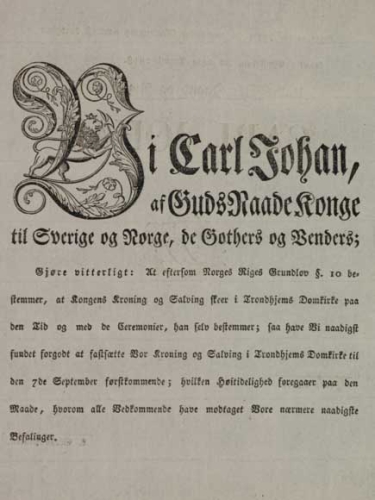 Kong Carl Johan vart krona i Storkyrkan i Stockholm 11. mai. Det norske folket var representert ved ein stortingsdeputasjon. Kroninga i Noreg følgde alt same sommar. I Grunnlova av 1814, i paragraf 12 – den såkalla kroningsparagrafen, var domkyrkja i Trondheim gjeven status som kroningskyrkja i Noreg, og den nye kongen ville nytte den lange reisa til å bli betre kjend med landet.