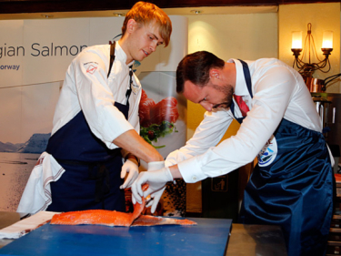 Promotering av norsk sjømat var første post på det offisielle programmet. Mesterkokken Geir Skeie fikk Kronprinsparets hjelp til å servere norsk laks for indonesiske gjester. Indonesia er den fjerde mest folkerike staten i verden, og et attraktivt marked for norsk fisk.