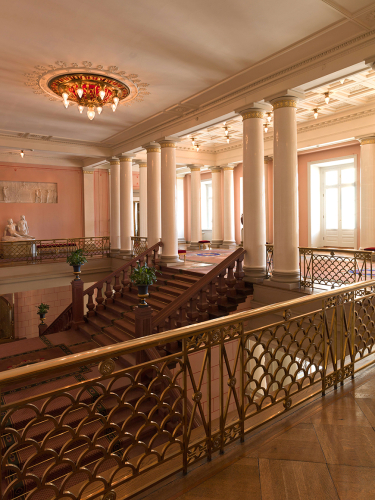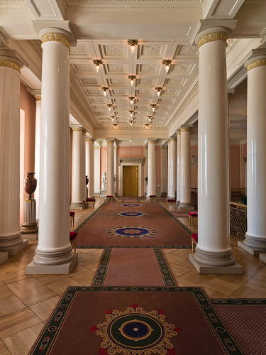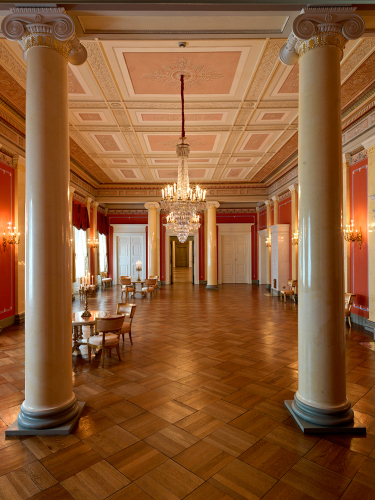 Dersom du skal på omvising på Slottet, går du inn Bakporten, som ligg på baksida av bygningen. Da kjem du inn i ein hall der du hengjer frå deg yttertøy, vesker og slikt. Der blir du møtt av ein guide, ein omvisar.