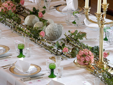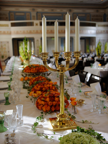 Noe av det flotteste på de dekkede bordene er de høye, forgylte sølvlysestakene med fire lys i hver. Disse er gaver fra Stortinget. De vakre dekorasjonene som pynter opp, er det Slottets egne blomsterbindere som har laget, og noen av blomstene er ofte dyrket fram i gartneriet i Slottsparken.