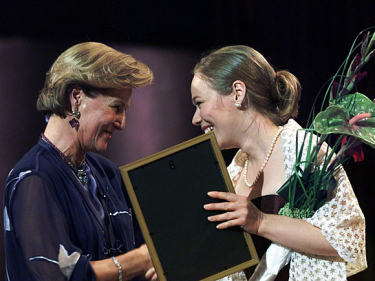 Daværende Kronprinsesse Sonja gratulerer Nigel Hill som vant den første finalen i det som den gang bar navnet Kronprinsesse Sonja internasjonale musikkonkurranse. Foto: Lars N. Sæthre, Aftenposten / NTB