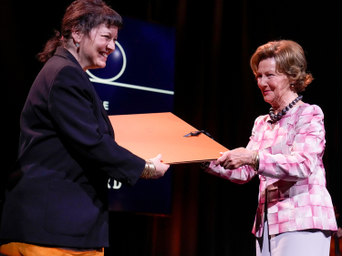 Dronning Sonja overrekker Queen Sonja Print Award 2022 til den fransk-marokkanske kunstneren Yto Barrada. Foto: Sven Gj. Gjeruldsen, Det kongelige hoff