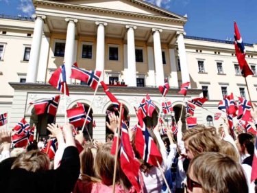 Vegen over Slottsplassen der Kongefamilien helsar frå Slottsbalkongen, er eit høgdepunkt på 17. mai. Foto: Heiko Junge, NTB scanpix
