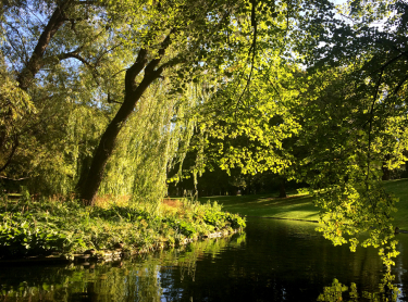 Dammene gir viktige bidrag til parkens atmosfære, med trær som strekker grenene ut over vannspeilet, andunger og lyden av rislende som holder suset fra biler og gateliv unna.