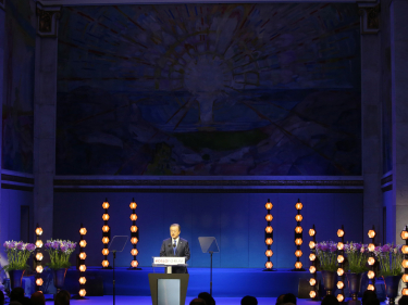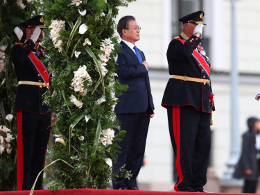 - Gjennom Deres initiativ, herr President, viste dere verden hvordan sport kan bidra til å bygge bro over konflikt og politikk. Etter en lang periode med uro og spenning, var det i februar 2018 en fredelig Korea-halvøy som ønsket verden velkommen til sportslig dyst. Det ble et OL i fredens tegn – midt i vinterlig kappestrid.