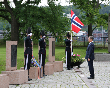 Det er tradisjon at besøkende statsoverhoder legger ned krans ved Nasjonalmonumentet på Akershus festning og på denne måten hedrer dem som har falt for Norge. I dag var seremonien på Akershus utvidet med nok en bekransning.