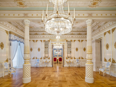 Den hvite salong, ferdig restaurert. Gjennom dørene skimtes Statsrådssalen. Foto: Øivind Möller Bakken, Det kongelige hoff