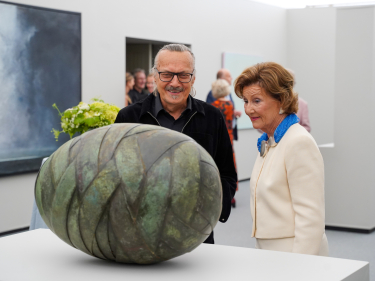 Dronning Sonja og kurator Sune Nordgren foran "Egg 2" av Pål Vigeland. Foto: Liv Anette Luane, Det kongelige hoff