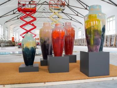 Publikum får også et glimt inn i Ridehuset som er under rehabilitering. Lokalet ligger ved siden av Dronning Sonja KunstStall og var en del av det samme stallkomplekset. Her står seks av Dronningens krukker utstilt. Foto: Liv Anette Luane, Det kongelige hoff