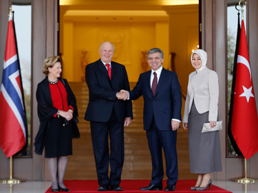 Kongen og Dronningen ble ønsket offisielt velkommen til Tyrkia av sitt vertskap, H.E. President Abdullah Gül og fru Hayrünnisa Gül utenfor Presidentpalasset i Ankara. Etter begge lands nasjonalsanger, inspiserte Kong Harald og President Gül æresvakten, før delegasjonene ble presentert.