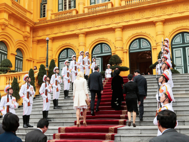 Kronprinsparet ble ønsket offisielt velkommen av Vietnams visepresident, H.E. fru Nguyen Thi Doan utenfor presidentpalasset i dag morges. Seremonien ble etterfulgt av samtaler med visepresidenten, og offisielle samtaler mellom den norske og den vietnamesiske delegasjonen.