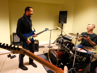 Kronprinsparet fikk ta del i den offisielle åpningen av Vestvågøys nye kultursenter under besøket i dag. "Meieriet" rommer både bibliotek og sal for konserter, konferanser og kino. Her finnes også øvingslokaler for musikk, og Kronprins Haakon fikk æren av å erklære senteret for åpnet ved å signere en gitar. Det ble mer gitar for Kronprinsen, som ble utfordret til å spille med av ungdommene i vandet Frozen Fire.