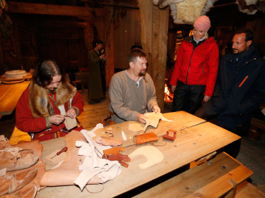 Inne i høvdinghuset ønsket høvding Terje Bøe og husfrue Kjersti Skaufeldt velkommen, og viste fram tradisjonelt håndverk som veving og skinnarbeider.