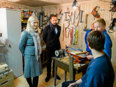 Kronprinsparets besøk i Gjerdrum kommune startet i Gudmund Vamsæters snekkerverksted, der elevbedriften "Flis & Fjøl" lager nye ting - ofte av brukte materialer.