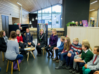 Besøket startet på Sørli skole etter en flott velkomst fra barn med flagg som hadde trosset været og tatt oppstilling langs Sørliveien.