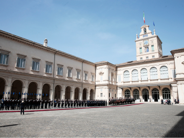 Velkomstseremonien fant sted i borggården utenfor Palazzo del Quirinale. Palasset ligger på Qurinalhøyden – en av Romas syv berømte høyder, og er den italienske presidentens offisielle residens. President Mattarella tok i mot Kongen og Dronningen sammen med sin datter, Laura Mattarella, som er Italias førstedame.