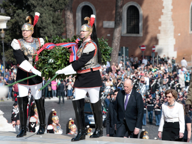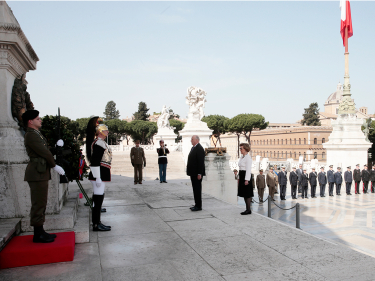 Kongeparet fortsatte sitt statsbesøk i Italia i dag. Dagen startet ved Italias nasjonalmonument, der Hans Majestet Kongen la ned krans ved Den ukjente soldats grav.