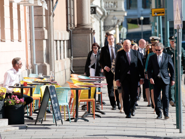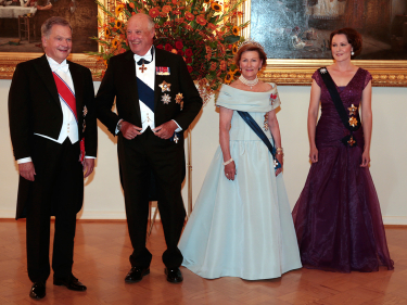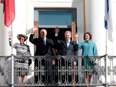 Deres Majesteter Kongen og Dronningen ble tatt i mot foran presidentpalasset i dag morges, der Hans Eksellense President Sauli Niinistö og fru Jenni Haukio ønsket Kongeparet velkommen til Finland med en høytidelig velkomstseremoni. Begge landenes nasjonalsang ble avspilt før Kong Harald inspiserte æresgarden, ledsaget av President Niinistö.