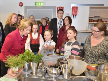 To av førsteklassingane ved skolen, Tora Marstrand Hasle og Dan Samson Girma, møtte Dronninga med blomster da ho kom til skolen. Deretter fekk Dronninga ei omvising på skolen i følgje med rektor Trude Mathisen og elevrådsleiar Frøy Ramsfjell. Da fekk Dronning Sonja besøkje både ein klasse med rettleidd skriving og ein klasse med norskopplæring på PC.
