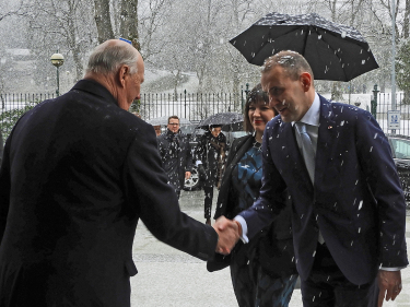 Snøvær møtte statsbesøket i Bergen. Presidentparet benyttet likevel anledningen til en tur på Bryggen. Foto: Sven Gj. Gjeruldsen, Det kongelige hoff.