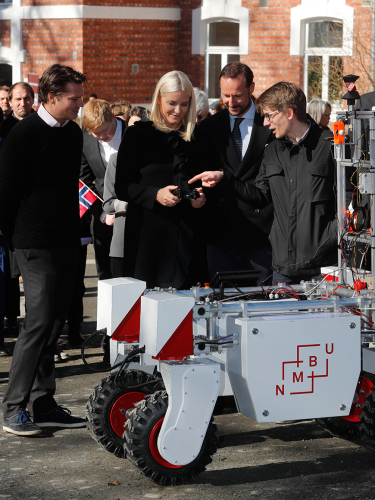 På spaserturen fra Urbygningen og opp til neste post på programmet, stoppet Kronprinsparet ved landbruksroboten Torvald. Rektor kunne fortelle at Torvald, som utvikles ved NMBU, er et viktig steg i retning av et mer bærekraftig landbruk. Den ser ikke ut som noen tradisjonell traktor, men målet er at den skal kunne gjøre mye av det samme arbeidet.