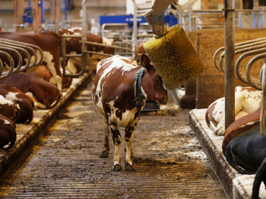 En av kuene benytter seg av børsten i "spa-avdelingen" i teknofjøset. Foto: Lise Åserud, NTB scanpix