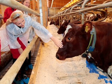 Ved NMBUs senter for husdyrforsøk forskes det blant annet på hvordan husdyrproduksjon kan bidra til en bærekraftig fremtid, noe Kronprinsparet fikk en innføring i under omvisningen i fjøset.