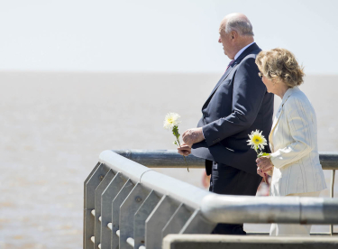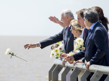Ved enden av muren gikk Kong Harald og Dronning Sonja ut på en platting der de kastet blomster på elven til minne om de mange som mistet livet. På plattingen møtte Kongeparet også representanter for menneskerettighetsorganisasjoner i Argentina.