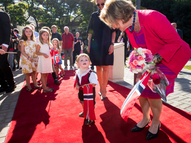 Dronningen fikk hilse på lille Lars Kristensen og andre fra det norske miljøet i Argentina på Plaza de Noruega. Foto: Heiko Junge / NTB scanpix