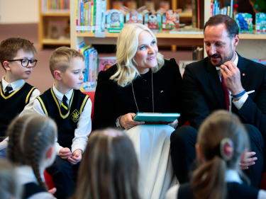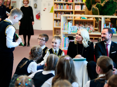 Kronprinsparet snakker med barn om bøker på Latvias Nasjonalbibliotek. Foto: Lise Åserud / NTB scanpix