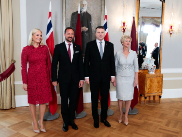 I kveld er Kronprins Haakon og Kronprinsesse Mette-Marit Presidentparets gjester ved en offisiell middag i Riga slott. Kronprinsen benyttet anledningen til å gratulere Latvia med 100-årsjubileet.