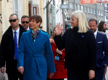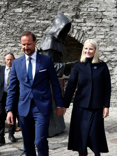 Kronprinsparet avslutta reisa med eit pressemøte på torget i Tallinn. Foto: REUTERS / Ints Kalnins / NTB Scanpix