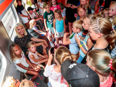 En bibliotekvogn full av barn på Marnardal stasjon :) Foto: Lise Åserud / NTB scanpix