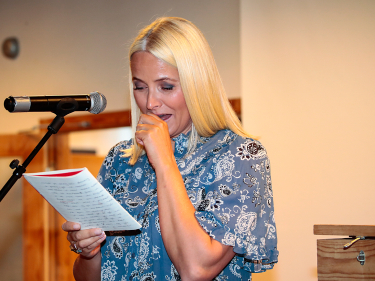 Kronprinsessen leste lattermildt høyt fra en av sine egne nynorskstiler fra ungdomsskolen. Foto: Lise Åserud / NTB scanpix