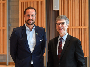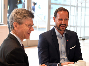 Kronprinsens innlegg ble rundet av med en samtale på scenen mellom ham og professor Jeffrey Sachs. Foto: Eileen Barroso / Columbia University