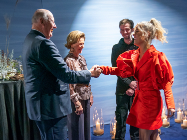 Artistene Alan Walker og Julie Bergan hilser på Kongeparet. De skal underholde under kveldens vennskapsmiddag. Foto: Heiko Junge / NTB scanpix