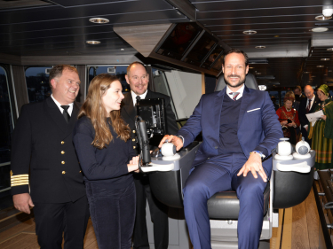 Kronprinsen og Prinsessen fikk en omvisning om bord etter seremonien. Her er de på broen. Foto: Rune Kongsro / Det kongelige hoff