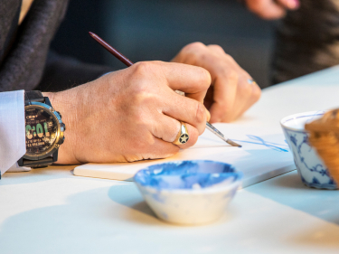 Kronprinsregenten malte navnetrekket sitt på en porselensflis. Den vil bli montert i den nye idrettshallen. Foto: Ole Berg-Rusten / NTB scanpix