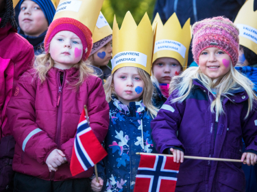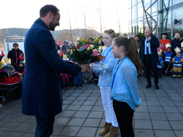 Kronprins Haakon ble møtt av barn med sang og flagg utenfor Frikslivssenteret på Kjølnes. Foto: Sven Gj. Gjeruldsen, Det kongelige hoff