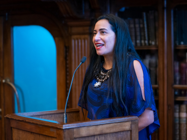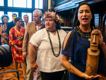 Tarita Alarcon Rapu, guvernør på Påskeøya, synger under tilbakeføringsseremonien. Foto: Heiko Junge / NTB scanpix