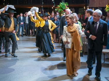 Om kvelden var Kong Harald og Dronning Sonja vertskap for en stor middag for norske og chilenske gjester - blant dem det chilenske presidentparet og Påskeøyas ordfører. Dronningen holdt velkomsttalen, og bilder Dronning Sonja har tatt på sine mange turer norsk natur var en del av utsmykningen. Det ble både kulturinnslag og mat fra begge land. Norske artisten Hilde Skaar var blant dem som underholdt.