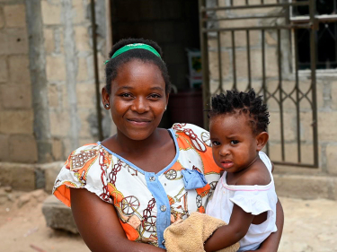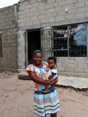 Belmira Americo Sitoe med Armando, familiens yngste, utenfor huset sitt i Matlemele. I dag fikk de strøm til huset. Foto: Sven Gj. Gjeruldsen, Det kongelige hoff