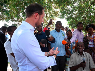 Kronprins Haakon i samtale med landsbyens eldste. Tilknytning til strømnettet vil gi store endringer og mange muligheter. Foto: Sven Gj. Gjeruldsen, Det kongelige hoff