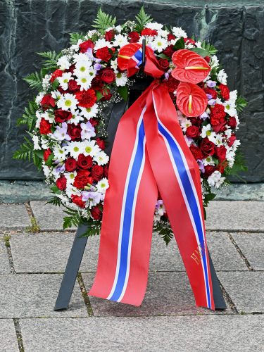 Kongen la ned krans ved «Nasjonalmonumentet for krigens ofte 1940–45», utformet av kunstneren Gunnar Janson og avduket i 1970.
