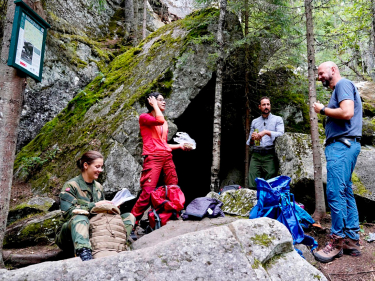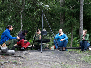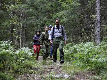 Langs stien på vei mot turens neste mål, møtte reisefølget en gruppe frivillige fra DNT Oslo og Omegn og Foreningen ØX - Østmarka på kryss og tvers. Det er disse frivillige som vedlikeholder og merker stiene i Oslomarka og som sørger for at folk kan ta turen ut av hovedstaden og nyte naturen langs kilometer på kilometer med turstier.