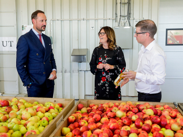 Siste tirsdag i september er den norske epledagen. Så hva passet vel bedre enn et besøk til et presseri? Kronprins Haakon hadde med seg en kasse med epler fra Skaugum da han avsluttet programmet for dagen med et besøk til Askim Frukt- og bærpresseri.
