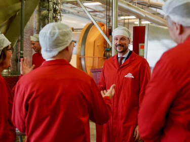 Kronprinsen får en omvisning på Askim Frukt- og Bærpresseri som startet opp i 1936. Foto: Simen Løvberg Sund, Det kongelige hoff