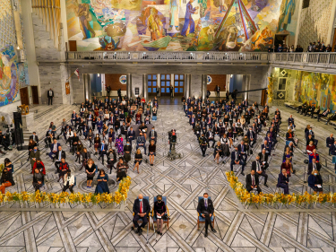 I dag mottok de to journalistene Maria Ressa og Dmitrij Muratov Nobels fredspris for sin kamp for ytringsfrihet i Filippinene og Russland. Kongeparet og H.K.H. Kronprinsen var til stede i Oslo rådhus under seremonien.